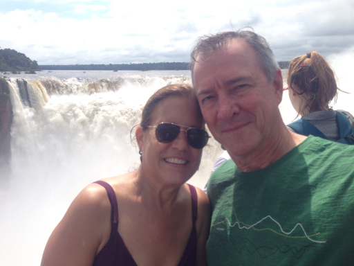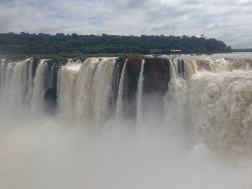 The viewing platform at the end of the boardwalk was packed with sightseers and commercial photographers blocking the railing in an attempt to charge a fee for the taking of portraits with the Falls as a backdrop. But we pushed our way through and finally made our way to the railing where I was able to take these photos of the Falls with the Brazilian shore in the background: