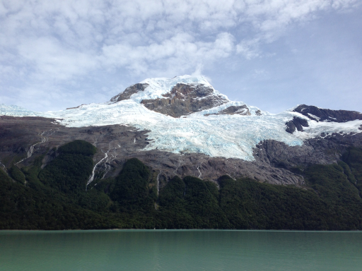 From Upsala, we motored south into the Brazo Spegazzini, passing two smaller glaciers along the way. The first was unusual because it sat high above the lake, never quite reaching it, even though you can see the limits of its march over the years (the grey-brown areas around its edges):