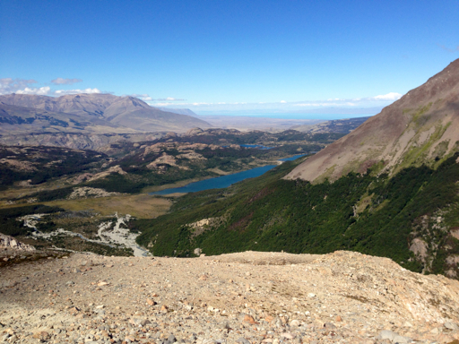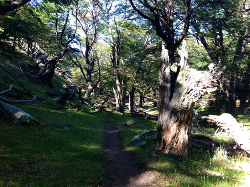 We emerged from the forest, much closer now to Monte Fitz Roy, where we could see the steep final mile up to the base of the mountain. If you look closely, you can see the trail traversing back and forth up the incline just above the trees in this photo: