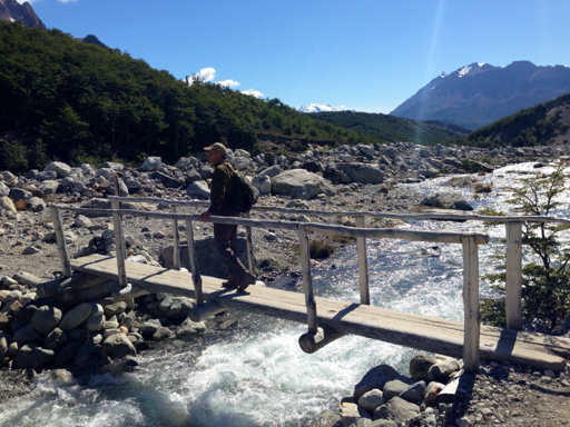 Passing through a small prairie, the trail then descended through that last small wooded area before coming to the river flowing down from Fitz Roy which we we crossed on a log foot bridge.