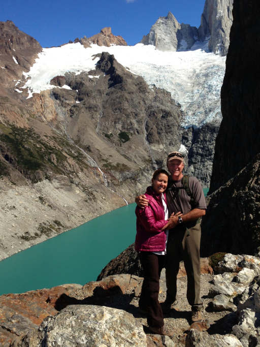 Here’s Dale near the start of our hike as we left Pilar, with Monte Fitz Roy off far in the distance, about 7 miles away: