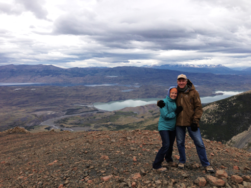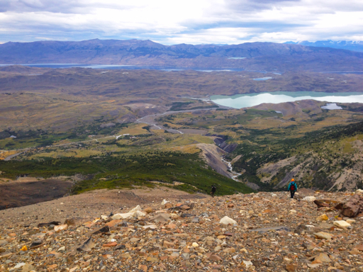 Here we are on top, with a view behind us of the valley from which we ascended. That’s Lago Nordenskjöld on the right and Lago Sarmiento de Gamboa on the left.
