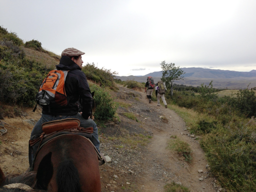After a while, we heard hikers coming up behind us at a very quick pace, loaded with tall packs that they made look weightless. To our amazement, they passed us. There were about 8 or 10 of them and Eduardo explained to us that they were porters, carrying the tents, cookware and supplies for a group of tourists that were hiking the “O” – a 93 km, 7-day hike around the Paine Massif.