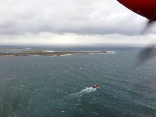 As we took off from Port Howard, we flew over the landing craft that functions as a supply ferry for the out-islands (it does not take passengers). Our destination, Carcass Island, gets all its supplies from this ferry when it visits Carcass every six weeks (the same for Saunders Island where we’ll be spending two nights).