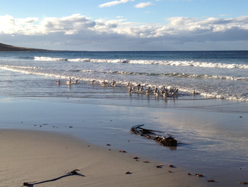 Not long after we made it down to the beach, a number of Rockhopper penguins came swimming and waddling ashore, surprising a lone Gentoo penguin in the process.