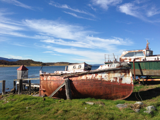 Until 1973, there was no road to Estancia Harberton and all of the wool produced here had to be shipped by water. With the exception of these derelict craft…