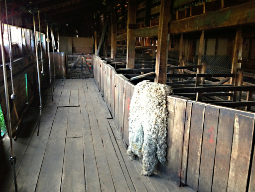 Inside the sheep-shearing shed there was an old steam-engine belt drive (later replaced by a diesel engine that you see in the foreground)…