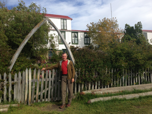 Bridges’ father-in-law was a carpenter in England and he built the original residence house there, then numbered the boards and components, loaded them onboard a ship, and sent them to Tierra del Fuego where the house was reassembled. Our guide called it the world’s first pre-fabricated home. Here I am, standing in front of the original house (the second floor was added later), next to a whale-bone entry arch.
