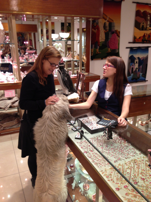 On the walk back to the car, I was thinking that canines really seem to find us attractive. Last night, we went shopping for a souvenir for the trip and found it at this store with a little help from a sheepdog that just wandered in.