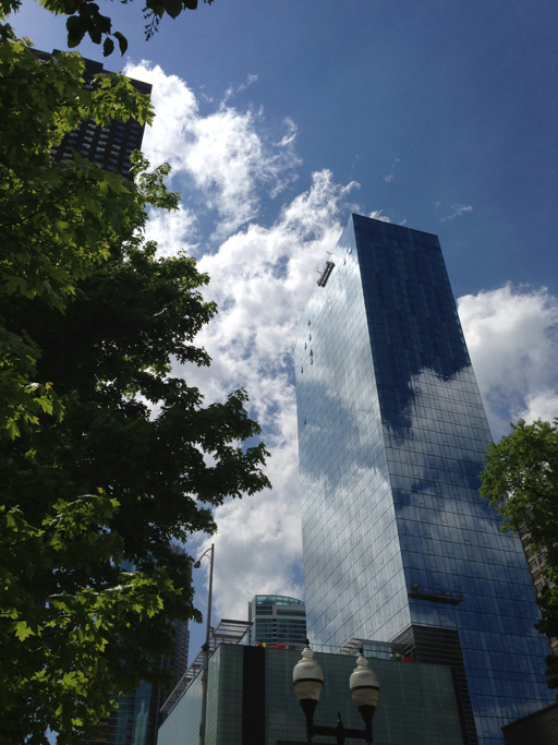 The Bean is not, however, the only cool reflective surface in Chicago. On our walk back to the Hyatt, we passed this office building, nearly lost to us in the clouds.