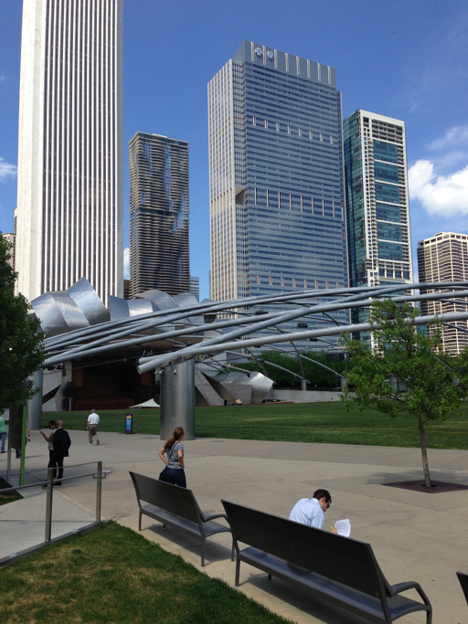 We were intrigued by the Frank Ghery designed Pritzker Pavilion, named for its main donor, Jay Pritzker, owner of the Hyatt hotel chain; that’s it on the left, below.