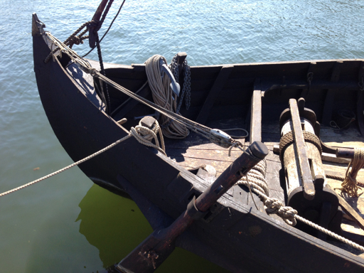 As I was examining the tackle at the bow, I glanced up to see the students we had observed further down the dock bearing down on me. It looked like they were going to T-bone the replica of Skuldelev #1 right in front of me!