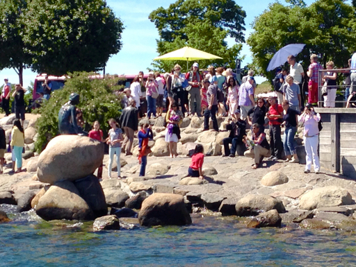 …and the backside of the Little Mermaid (she’s up there on top of the rock). Frankly, I liked this view better than the one we would have gotten from the land. I always enjoy taking pictures of throngs of people taking pictures and this one has the bonus of the girl in the red sweater striking a Little Mermaid pose.