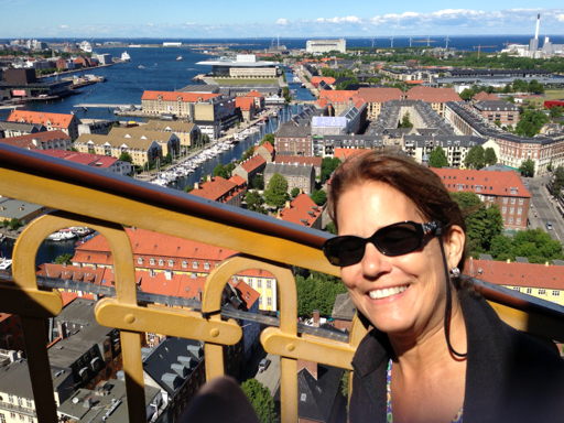 Here’s the view from the top of the tower, looking toward the southeast. Way off in the distance you can see the bridge to Malmö, Sweden. Also, take a look at the church tower in the center of the photograph, then look just behind and to the left of that tower and you’ll see another spire in the distance. That’s our next stop, Vor Frelsers Kirke, across the waterway in Christianshavn.