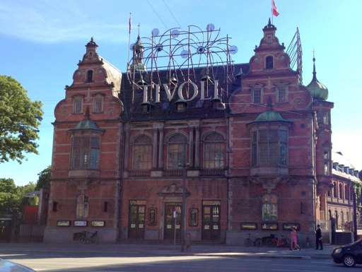 The main entrance to Tivoli Gardens is around the side, directly between City Hall and the train station. As we walked west near quitting-time for city workers, the sun and an elongated cloud reflected off an adjacent, mirrored building. Yep, it was around 5:00 p.m. when I took this photo, although it felt like early afternoon since the sun was still so high in the sky.