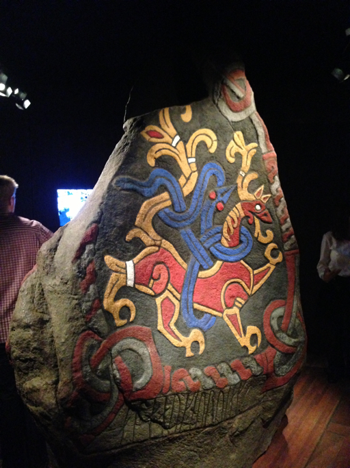 …and this painted reproduction of King Harald Bluetooth’s Rune Stone that we saw in Jelling – here you can easily make out the snake encircling the lion. This is supposedly how the rune stone would have looked back in the day.