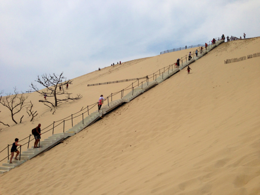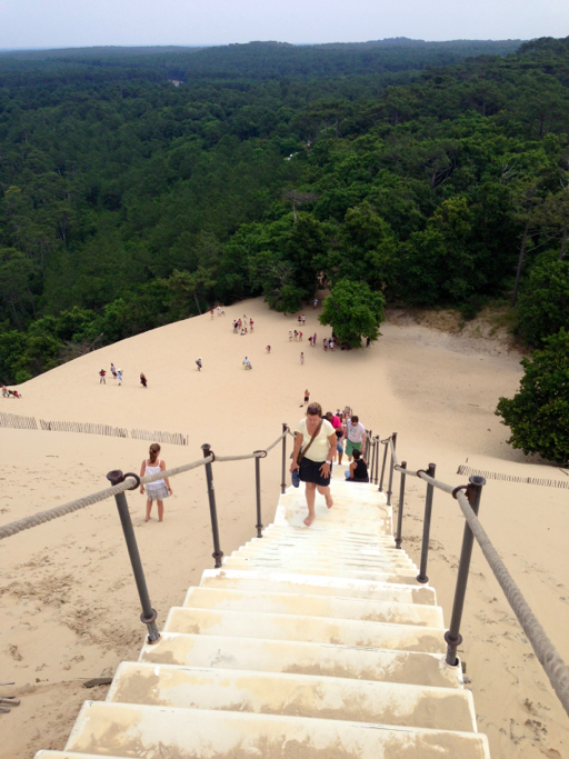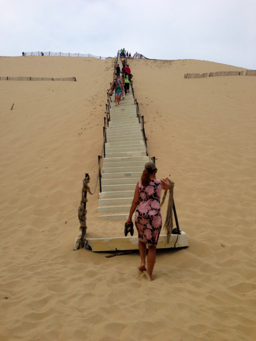 After lunch, we drove south around Arcachon Bay toward the gigantic sand dune known as Grande Dune du Pilat. This dune is almost 350 feet high and is supposedly the tallest sand dune in Europe. Fortunately, there’s a fiberglass staircase going up a good part of the way.