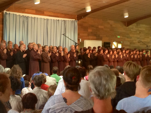 The Dharma talk began with the monks and nuns “chanting,” although, being accompanied by a violin and viola, it wasn’t what I was expecting: no simple “Om mani padme hum” mantra for this group (by the way, Thích Nhất Hạnh is seated next to the bell, out of sight, in the middle of the photo, below).