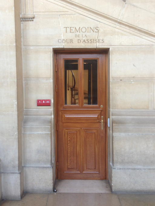 Witnesses waiting to testify are sequestered underneath the stairs to the Cour d’Assises where they have their own internal entrance into the courtroom; you can see it through the window.