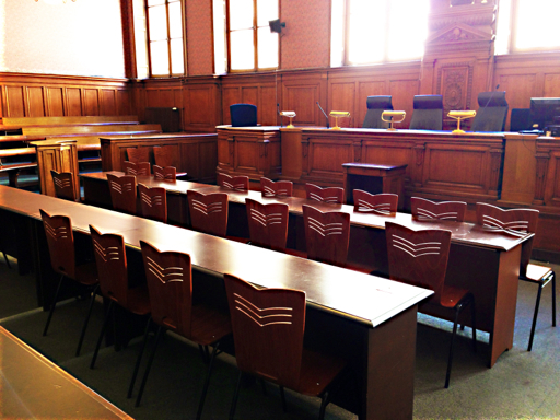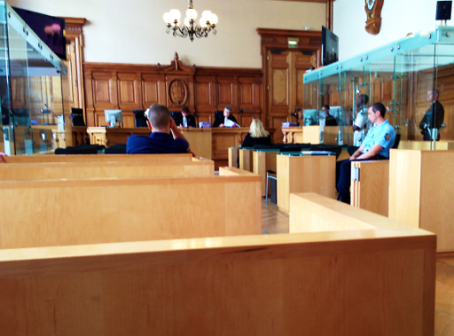 There are a couple important things to notice in this photo. First, the defendant is sequestered in a see-through box – he is led in and out of the courtroom through a separate access. Second, there are 3 judges – this is the case in appeals and at trial, unlike in the U.S. were trials are always before a single judge. And, third, lawyers, as well as judges, are required to wear robes in court; the seated blond woman is the defense attorney.