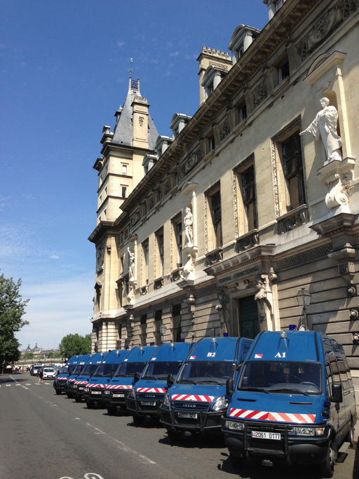 We met Laurent in front of the gate to the May Courtyard and he took us around to the other side of the Palais. Along the way, we walked down the Quai des Ofrèvres and this line-up of Police paddy-wagons.