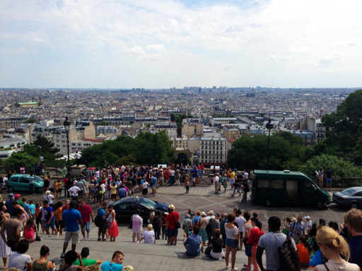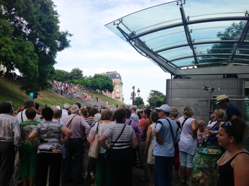 In the photo, above, you can just make out the top of the Basilica of the Sacred Heart at the summit of Montmartre. It’s an impressive structure, but we were stopped in our footsteps by the humongous crowd at the top of the funicular.
