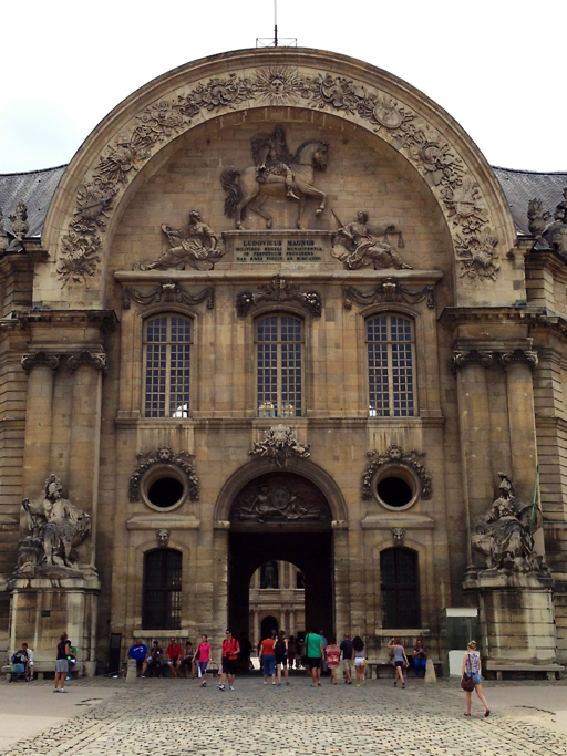 The entrance to the main courtyard of the Hôtel National des Invalides is crowned by a likeness of King Louis XIV on horseback, just below the “Sun King” emblem at its apex.