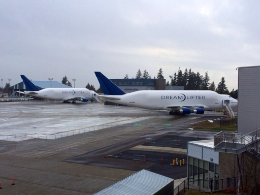 Boeing modeled its moving assembly line on the process used by Toyota. The line, itself, creeps along at 2 inches per minute. Component sections are built in factories around the world and then flown to Everett where they are assembled into a completed aircraft. Boeing has modified four wide-body 747s that it calls its Dreamlifters, turning them into cargo planes used to haul these components around the world; two of the Dreamlifters were on the tarmac next to the museum when we visited,