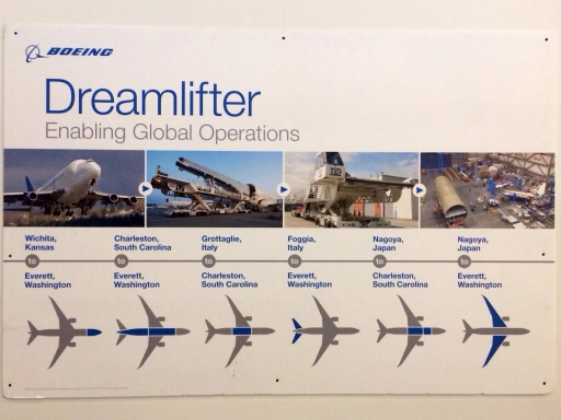 And here you can see where the Dreamlifters have to go to retrieve all the components; the cockpit comes from Wichita, Kansas, the tail fuselage from Charleston, South Carolina, the rudder, horizontal stabilizers and elevators from Foggia, Italy, and the wings from Nagoya, Japan: