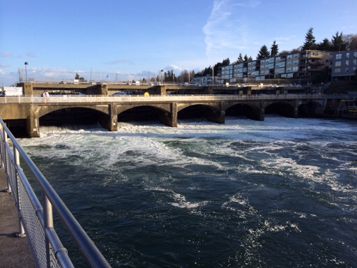 The system, in use since 1916, consists of two locks: a large one for more commercial vessels (80′ wide and 825′ long); and, a smaller one that seems to be geared for recreational boats and fishing vessels (30′ wide and 150′ long). There’s also a spillway to maintain the level of the lakes, which can be as much as 26′ higher than the Sound, complete with a fish ladder used by spawning salmon.