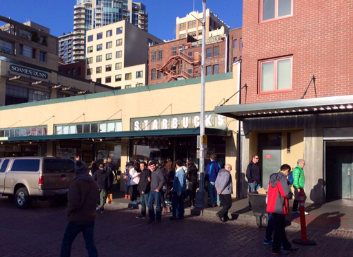 We were in search of the Original Starbucks Coffee shop. Coffee is a religion in the Pacific Northwest and the High Priestess is Starbucks. Started in 1971 and still based in Seattle, Starbucks is now the largest coffeehouse company in the world, currently with 20,891 stores in 62 countries, including 13,279 in the United States; in our travels, we’ve probably visited more than a hundred of them. Here’s the store in Pike’s Market that most people believe is the first Starbucks cafe. I’m sure there’s always a crowd waiting to get in.