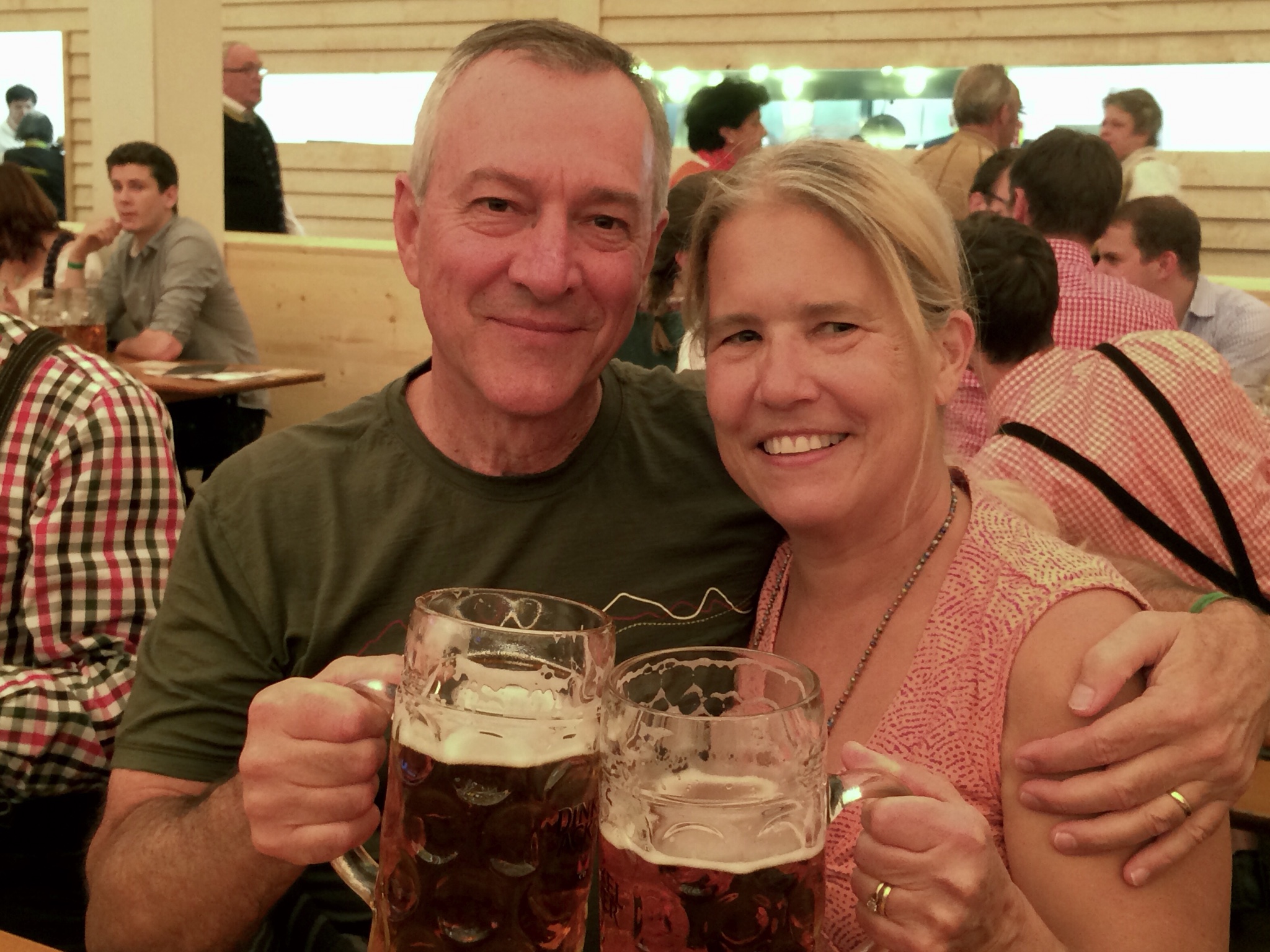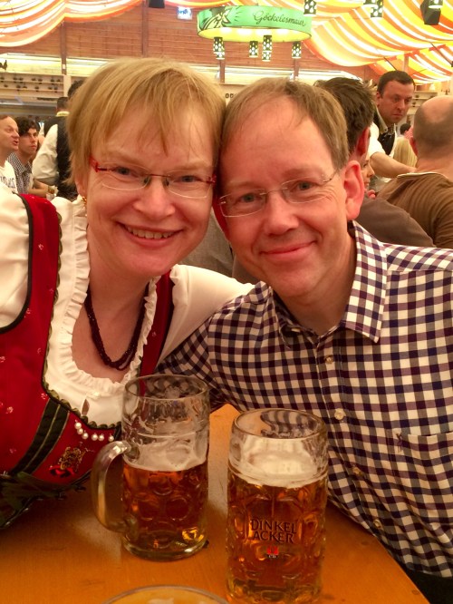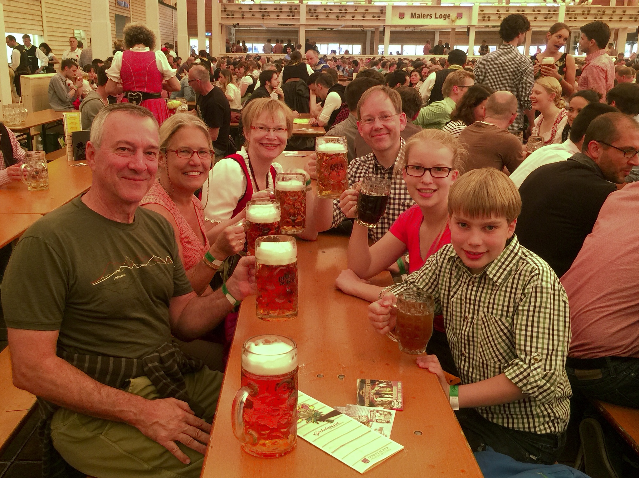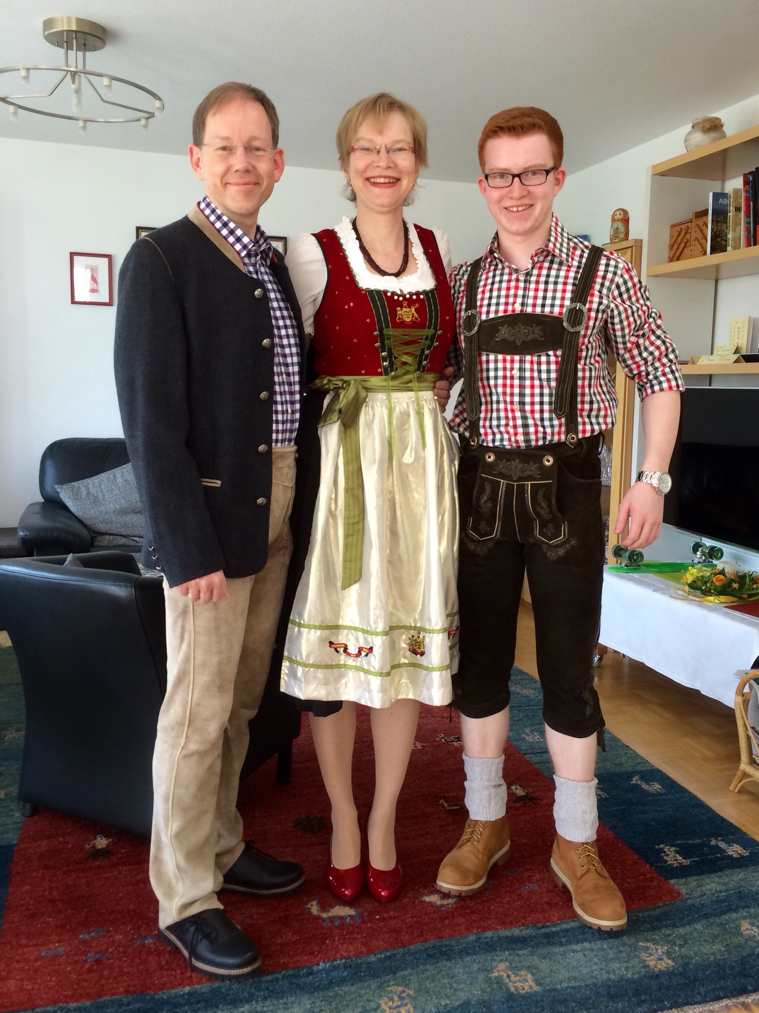 Many of the attendees wear traditional Swabian costume and our family went in full regalia. Here are Jörg in his meisbacher jacket (I think I got that right), Heike in her dirndl and Christopher in his lederhosen – all dressed up and looking for a beer garden.