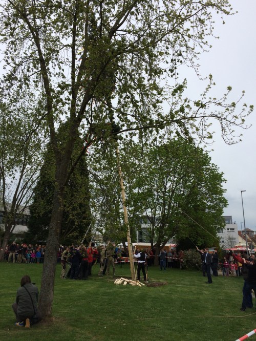After our walk, we all went over to the Rathaus, the City Hall, for the raising of the Maibaum, literally, the “May tree” – we would call it the May Pole.