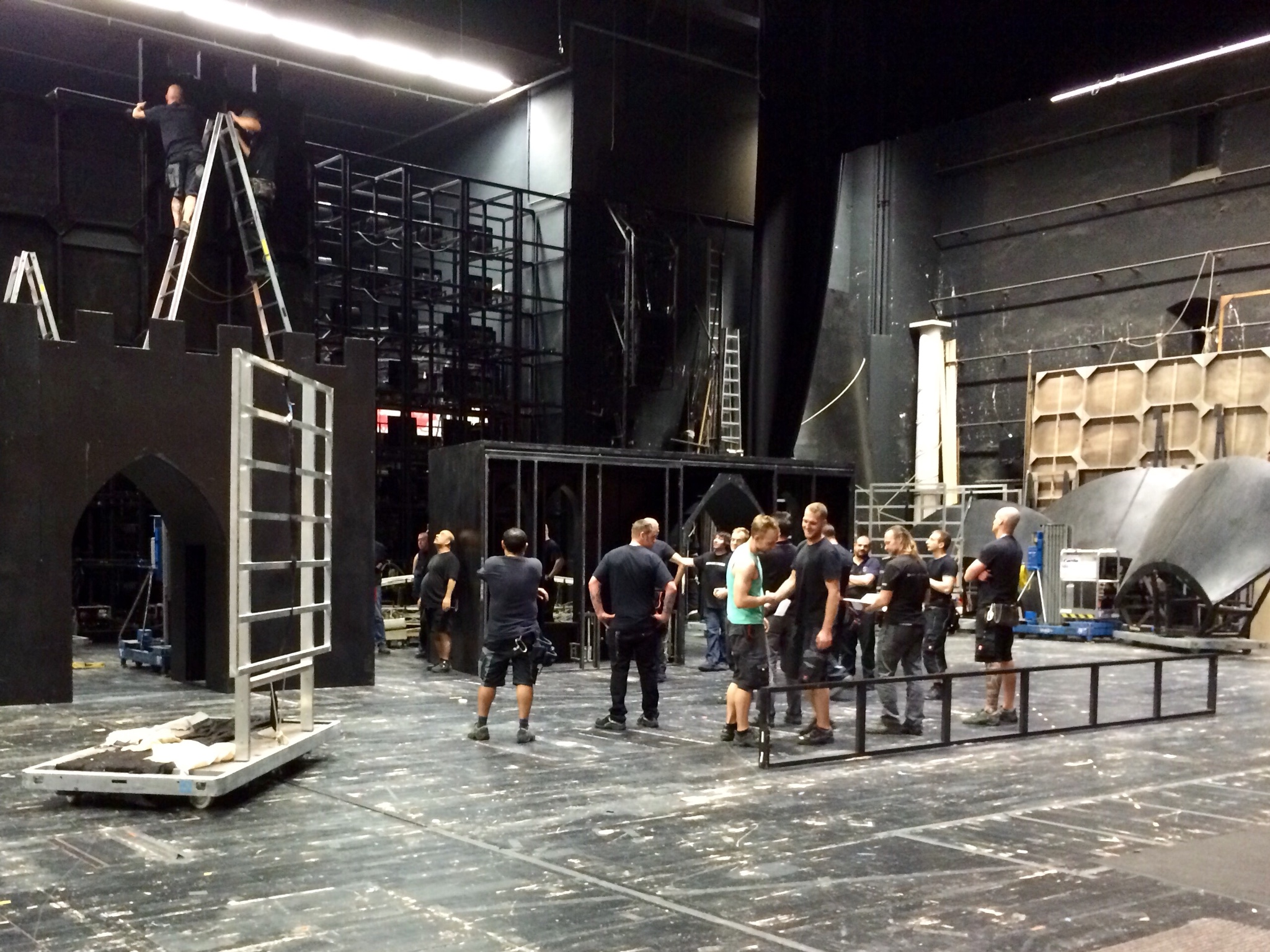 The sets are all pre-fabricated and stored along the side walls, then brought out and assembled, as needed. They sure had a bunch of workers putting up the set for that night's performance.