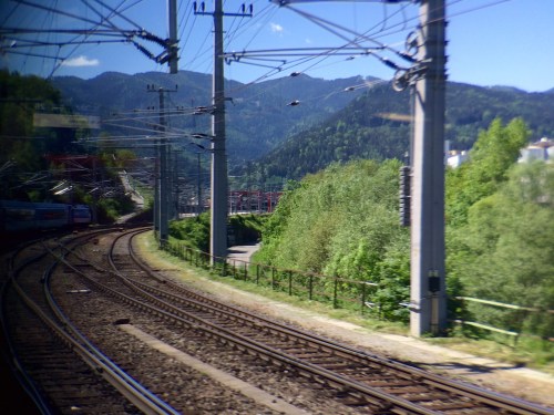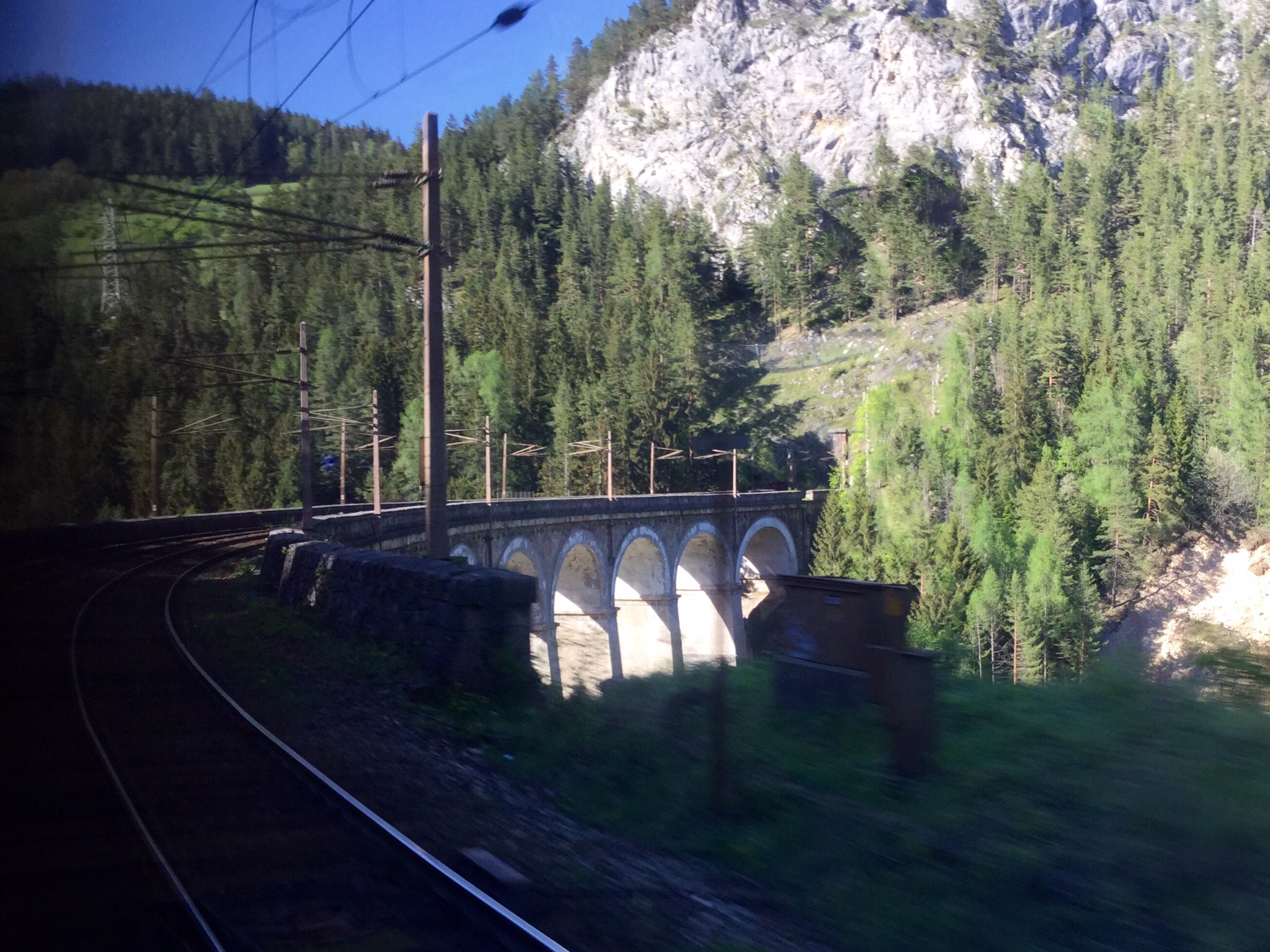 Most of the trains in this part of Europe, including the high-speed RailJet we were on for this trip, are electric, which allows them to accelerate really quickly, smoothly and silently. If you’ve ever ridden in an electric car, you’ll know what I mean. At any rate, as the grade steepened and the track began to wind and twist over the numerous viaducts along the route, we slowed down to around 45 mph going over Semmering Pass, elevation 3,166 feet above sea level, a little more than 2,500 feet higher than Vienna.