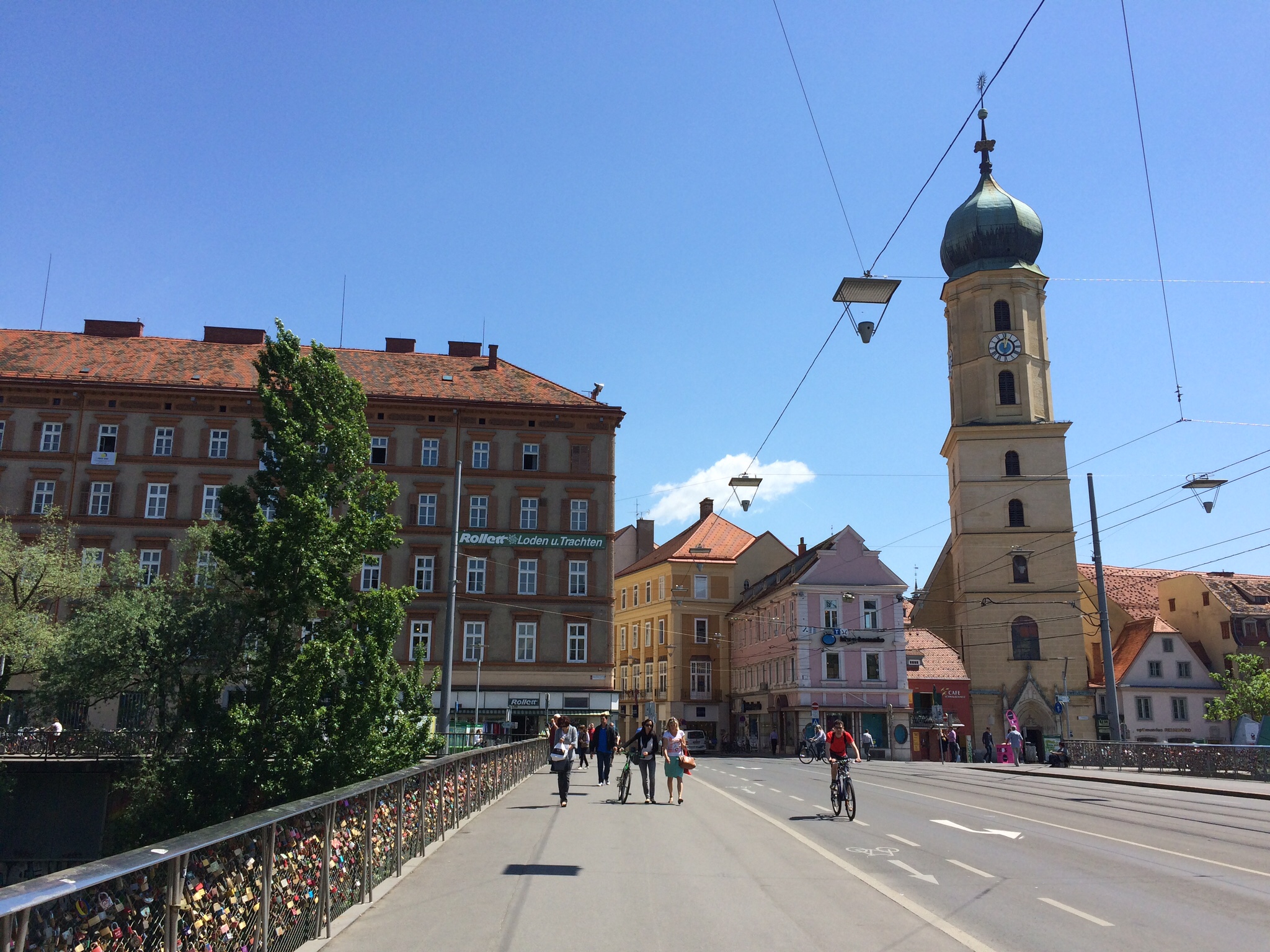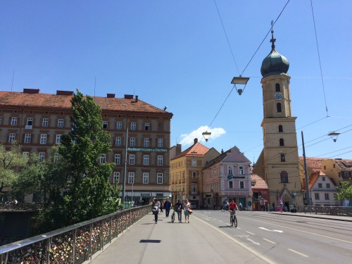 We walked east from the train station in Graz to the bridge over the Mur River into the old city. You can see the influence of the Ottoman Empire here in the minaret-like steeples. As in Paris, there’s a tradition here of attaching Love Locks to the bridge.