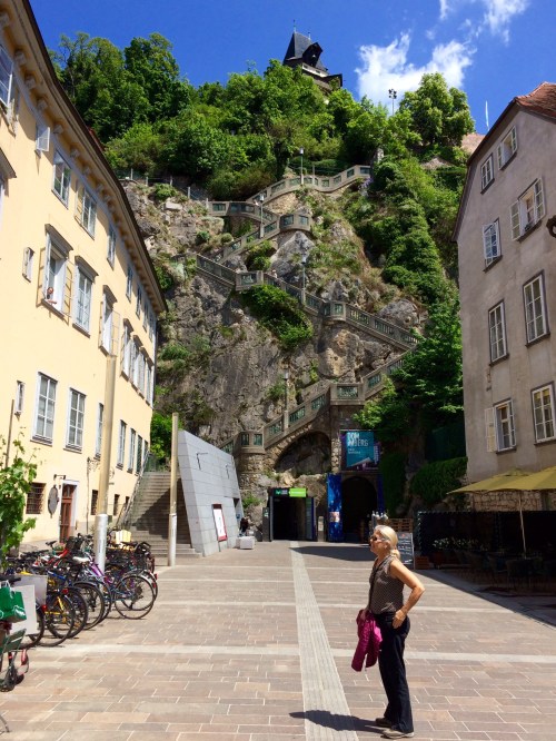 We paused briefly on the bridge to look upstream at the Murinseln, a restaurant constructed in the middle of the River, and to orient ourselves for our journey up to the top of the Schlossberg, which means “Castle Hill” in German; you can see it on the right in the photo, below. On the top is what’s left of the castle and on the right you can see the Uhrturm, the clock tower.