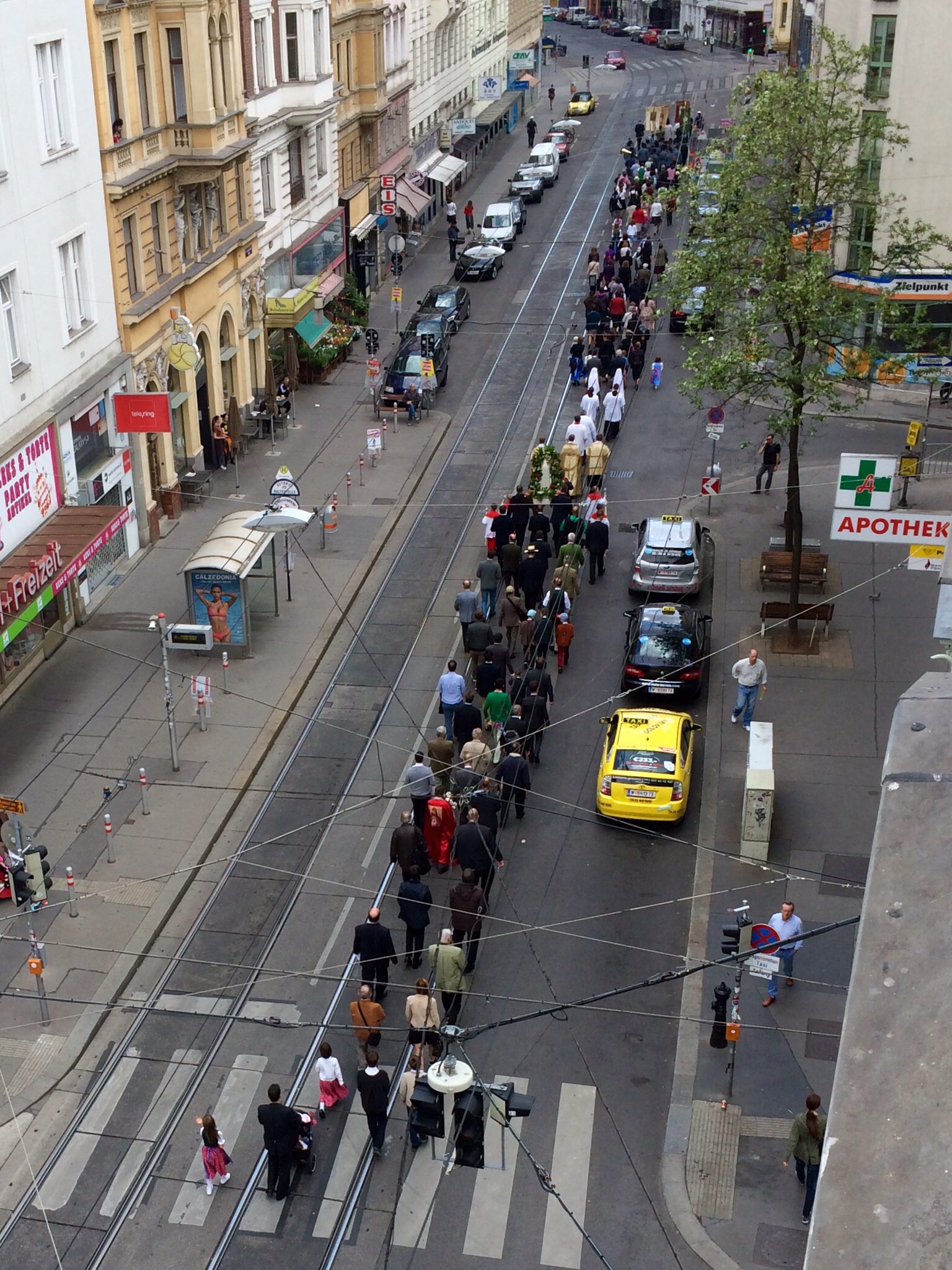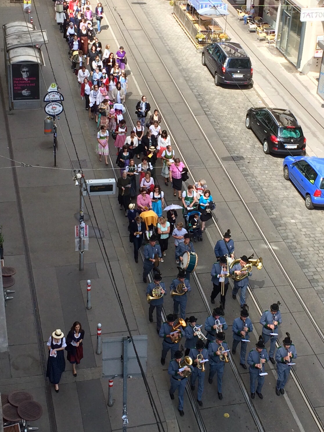A little before noon, we heard music out on the street – a procession featuring a brass band and a number of people in traditional dress, playing and singing hymns proclaiming the ascension of Jesus into heaven forty days after Easter.