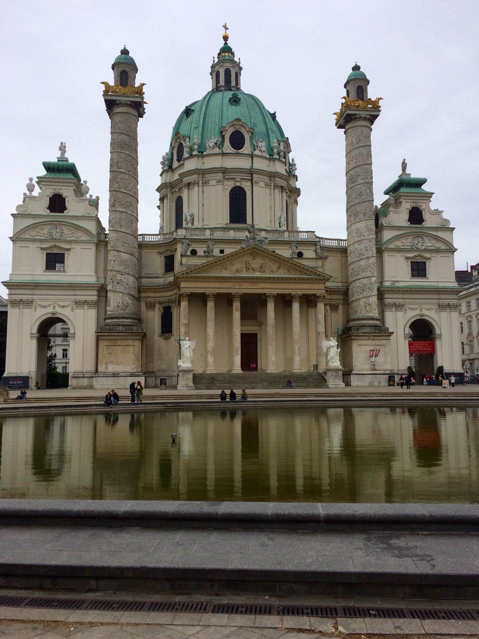 Slightly outside of the Ringstraße and adjacent to the Wien Museum near Karlsplatz is another parish church, St. Charle’s (Karlskirche), built in 1716-1737 at the behest of Emperor Karl (Charles) VI, commemorating the victims of the Plague of 1713. We contented ourselves with just admiring this one from outside.