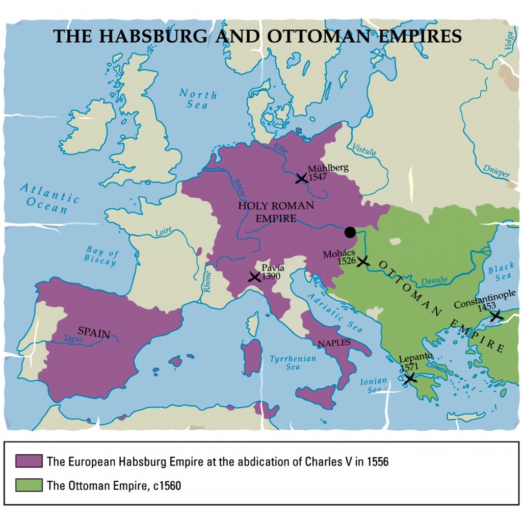 I mentioned previously that in 1453 the Ottoman Turks conquered Constantinople, which they renamed Istanbul. Having already conquered most of the Balkins, they continued up the Danube River Basin all the way to Vienna (the black dot on the map, below) where they confronted the Holy Roman Empire of the Habsburgs. The Ottoman siege of Vienna in 1529 failed, however, and Vienna remained the bulwark against further Ottoman incursions into Europe for the next 200 years, during which time the two empires raided back and forth with much of the fighting taking place on the Hungarian Plain.