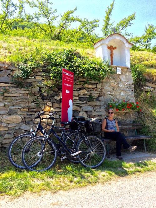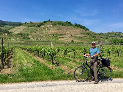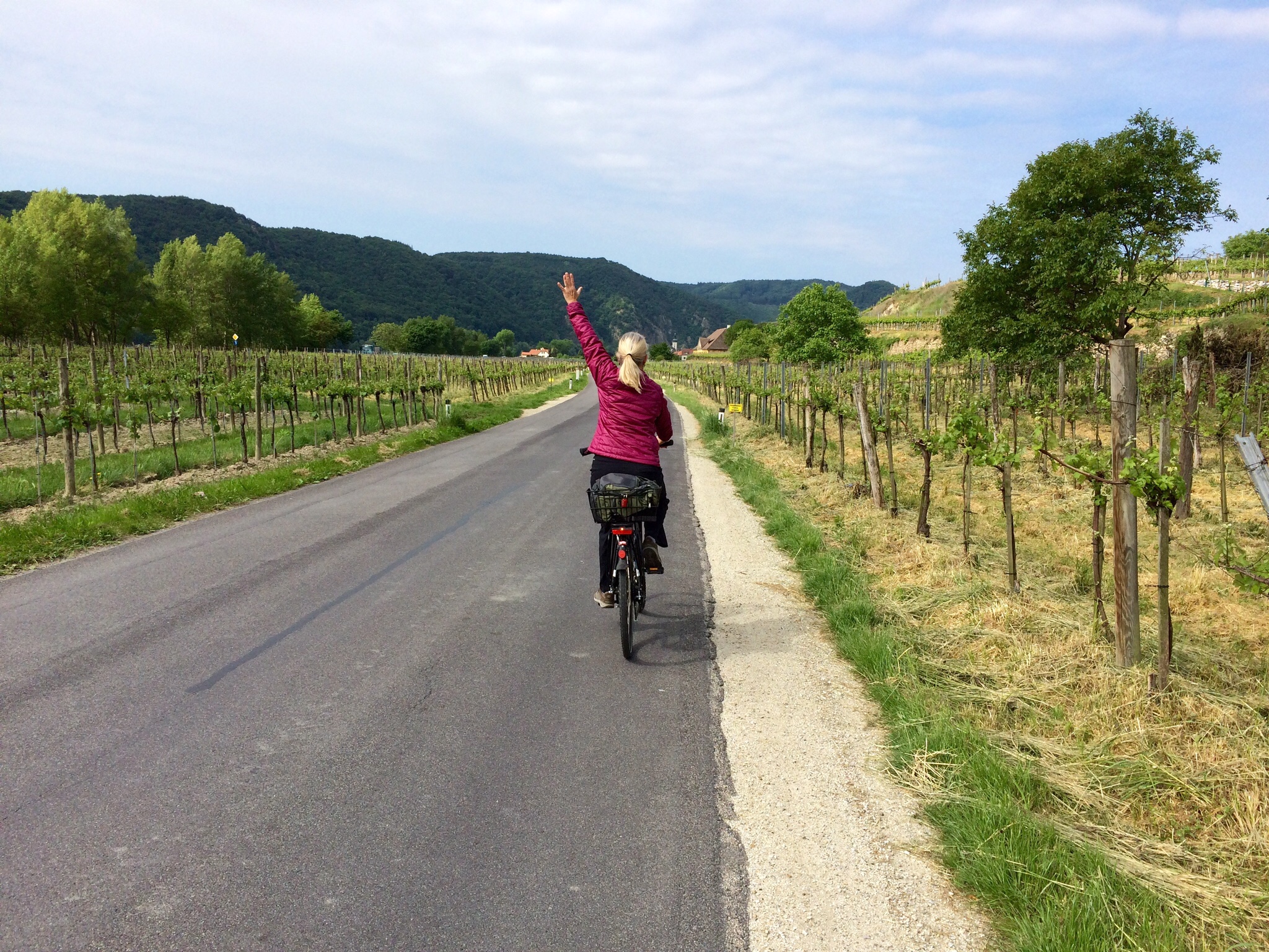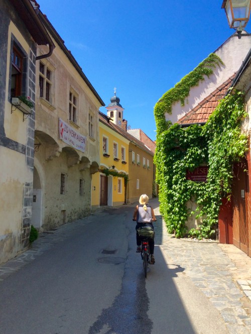 We arrive in Krems, supposedly the oldest extant town in Austria (established by 995 A.D.), and found a nearby cycle shop, rented a pair of bikes, tucked our backpacks into the baskets, and then off we went, peddling through the Austrian wine country known as the Wachau Valley, yet another UNESCO World Heritage Site.