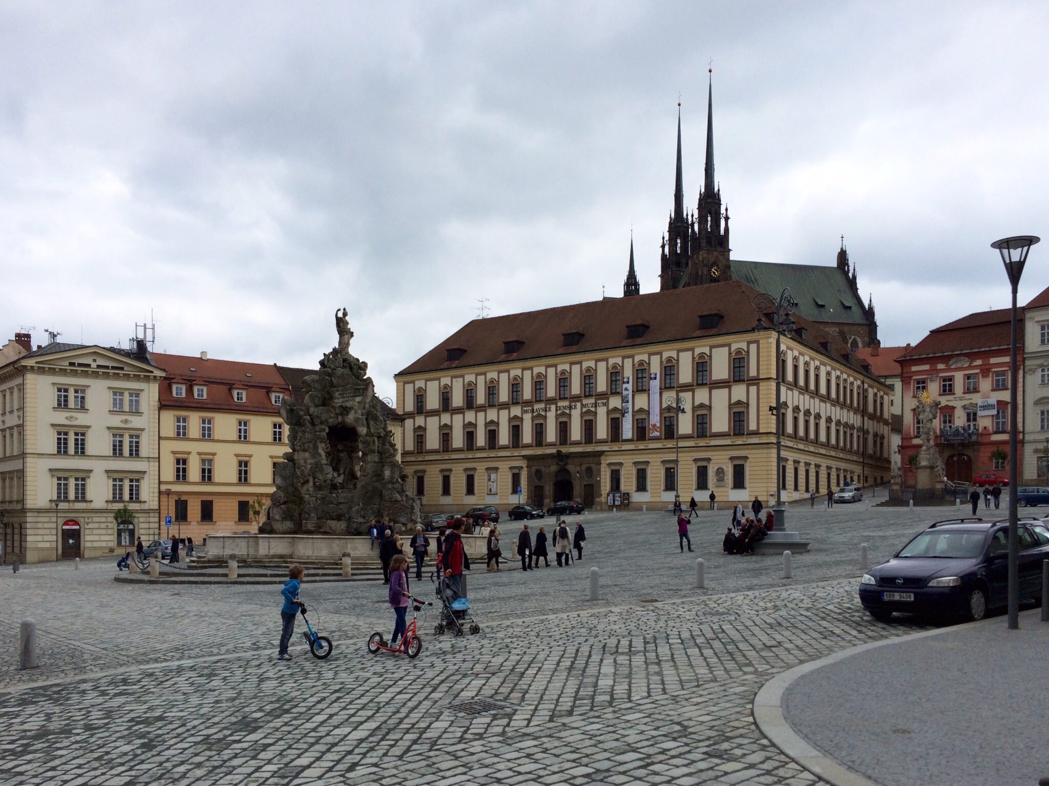Below is a photo of the Vegetable Market square; the building in the background is the Dietrichstein Palace, built in 1613-1616, which is now the Moravian Museum. Towering above the Dietrichstein Palace are the twin spires of the Cathedral of Saints Peter and Paul.