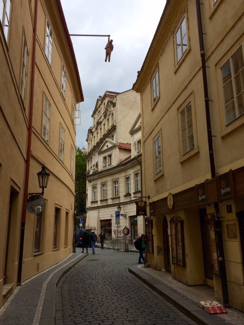 It was mid-afternoon so we decided to head back to the hotel to rest and freshen up before going back out for dinner. As we turned down Husova Street near the hotel, we looked up to see somebody hanging on for dear life up above us: