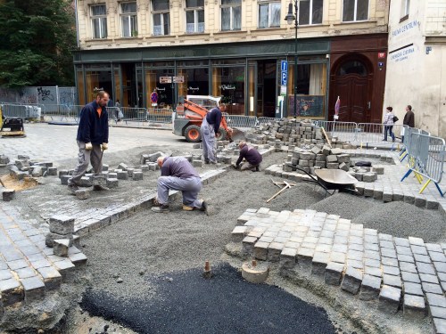 Right around the corner we found more art in public places: the street crew was remaking the cobblestone road after doing some sewer work.