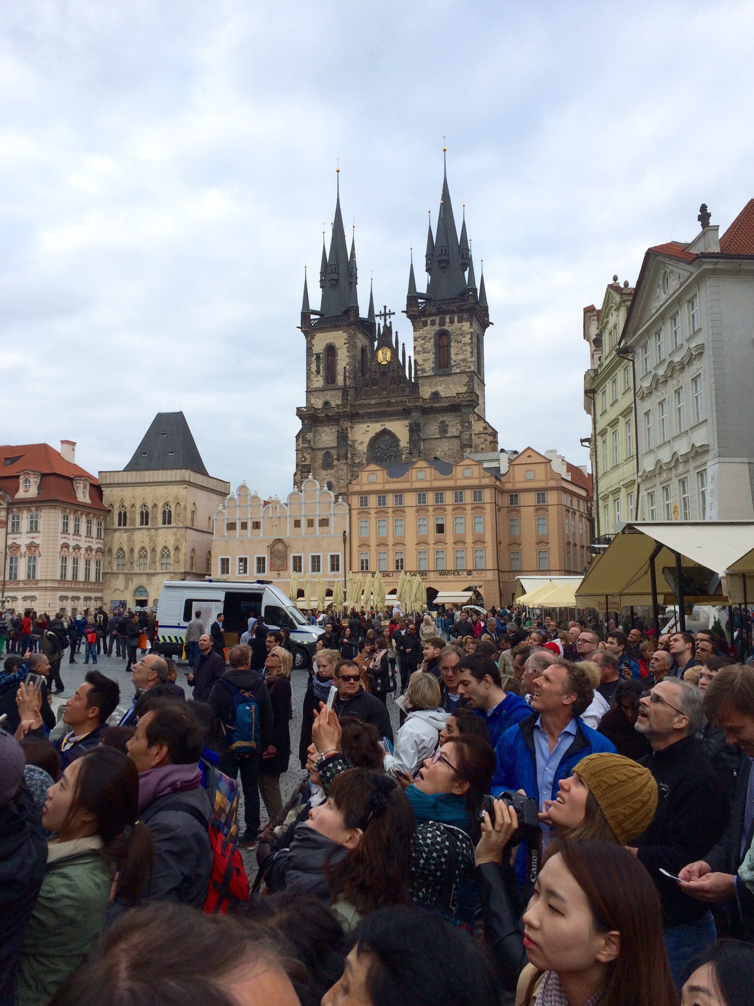 We arrived at the Orloj a little before 7:00 P.M. Soon, a crowd of people settled in around us, everyone staring up at the upper section of the clock, eagerly awaiting the striking of the hour, cameras at the ready: