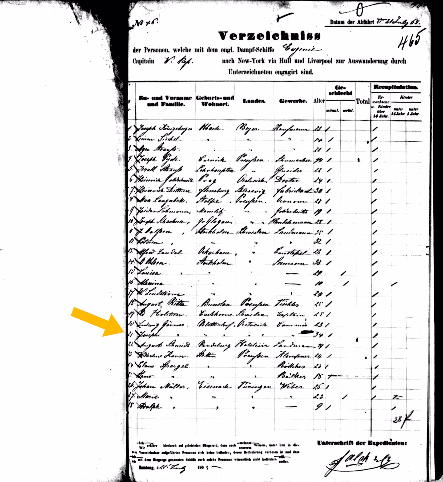 Joseph was 34 at the time of his emigration and was apparently traveling with his younger brother or cousin, Ludwig Görner, given that they were traveling together and were both listed as being chamber musicians from Blottendorf, Österreich (in German: Austria; which was then in the Kingdom of Bohemia, part of the Habsburg's Austrian Empire).