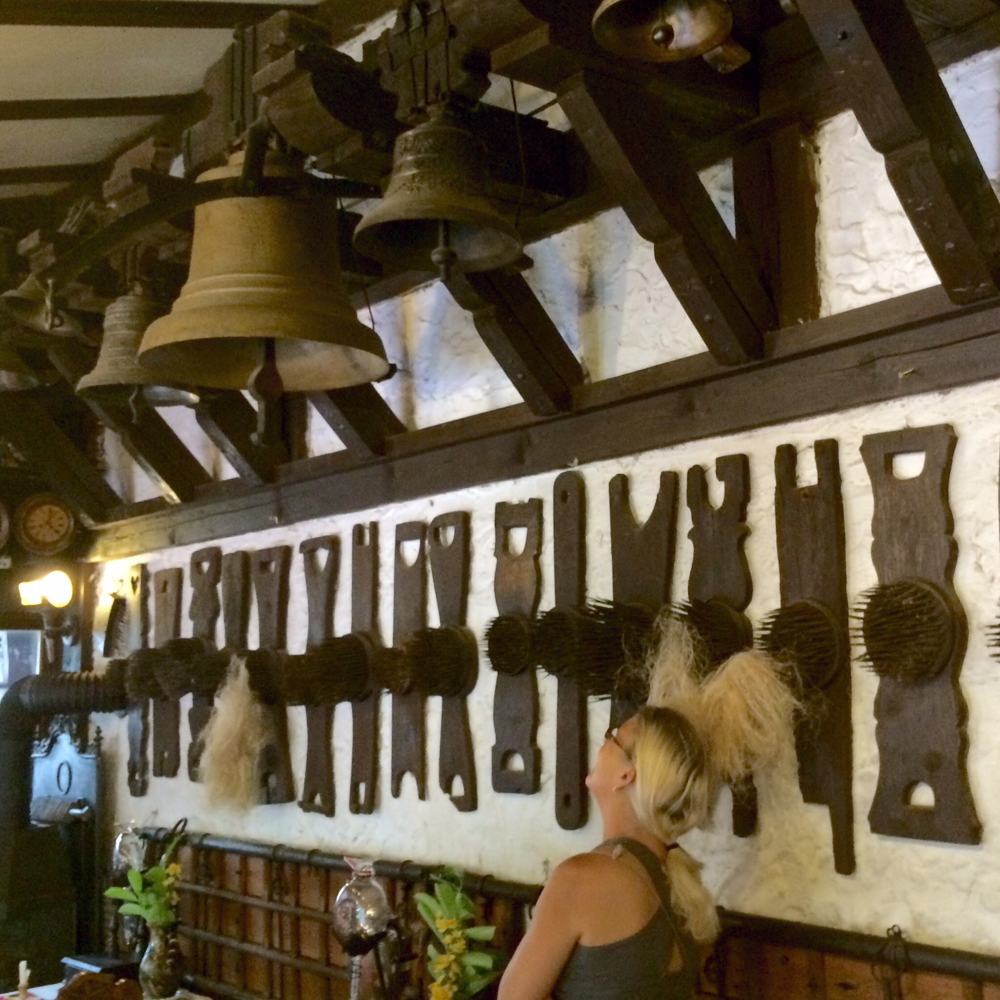 As we were leaving, the hostess saw that we were interested in their collection of antiques, so she led us into a rear dining room where she flipped a switch that turned a crankshaft that rang all these church bells for us. Quite a clatter.