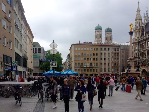 We started and ended our afternoon here, emerging from the subway near the “U” sign on the left, and having coffee under the blue umbrellas before descending on our way home. By the way, the two domed towers you see across the Marienplatz in the photo, below, belong to the Frauenkirche, the cathedral of the Archbishop of Munich, which can supposedly accommodate 20,000 people. The building just peeking out on the right is…