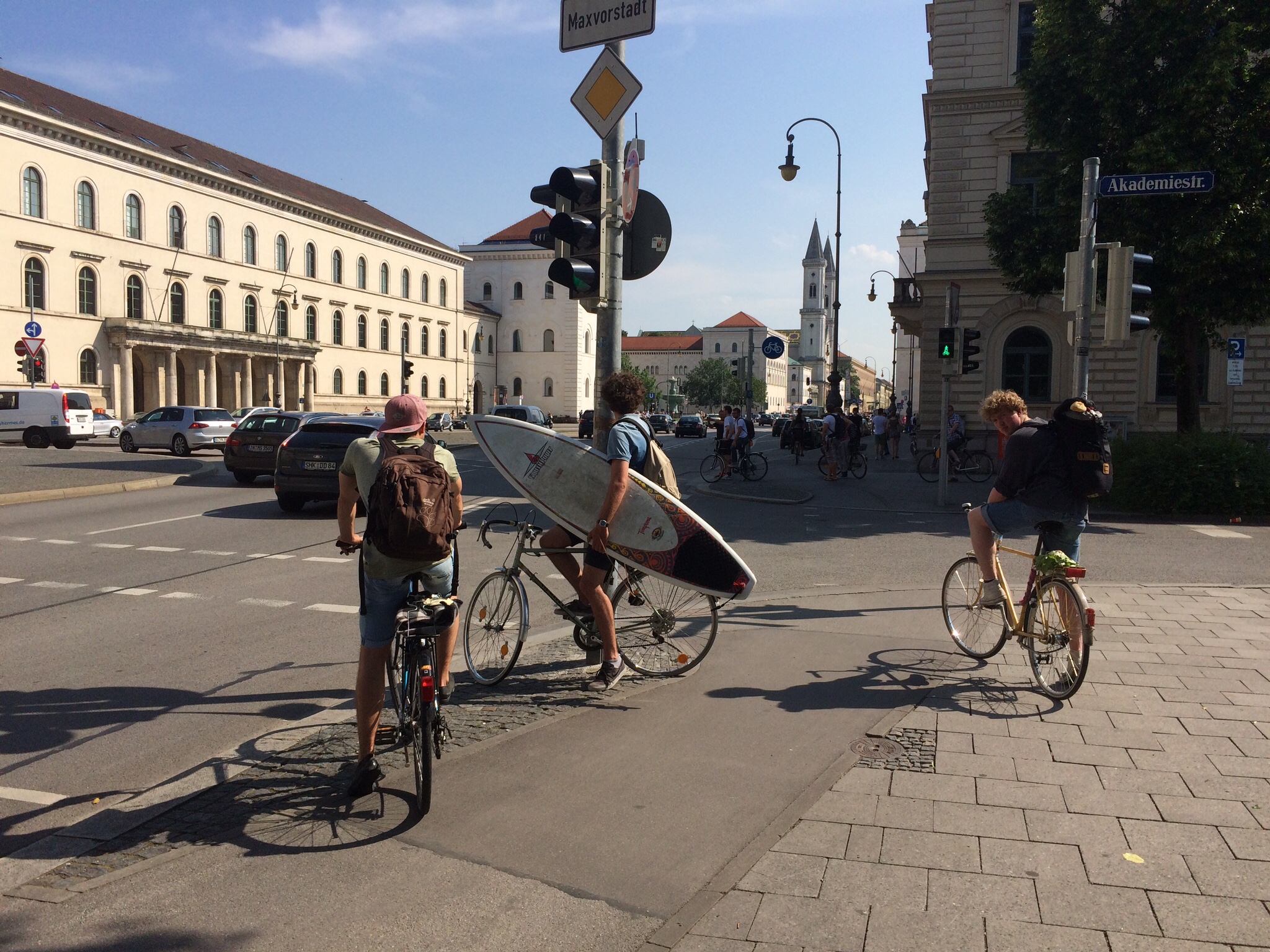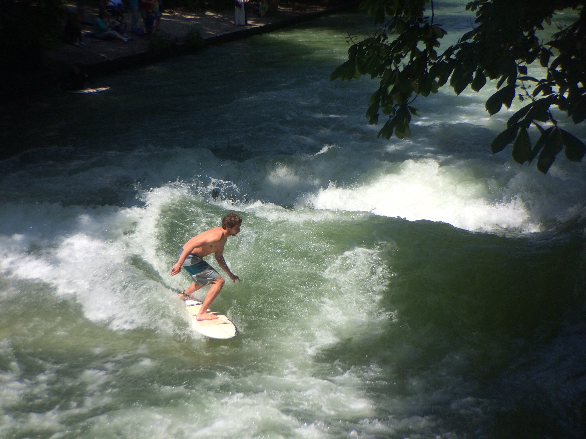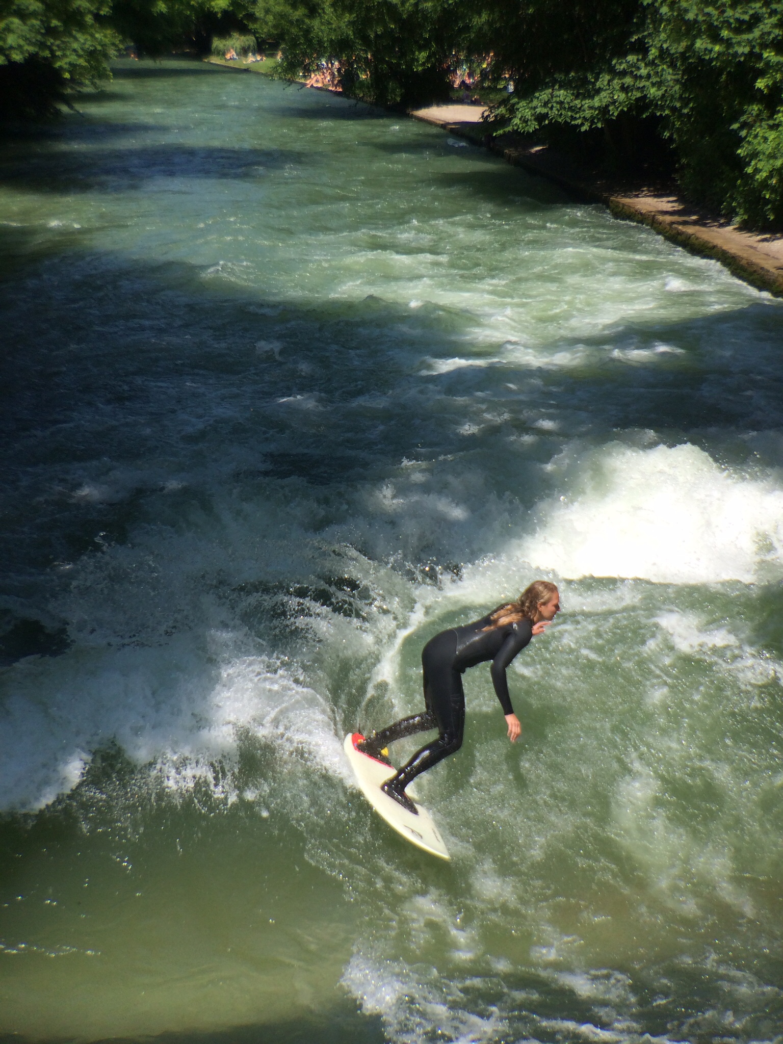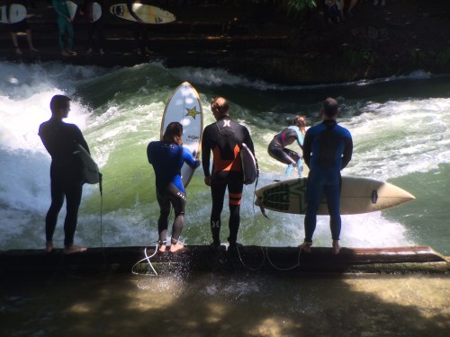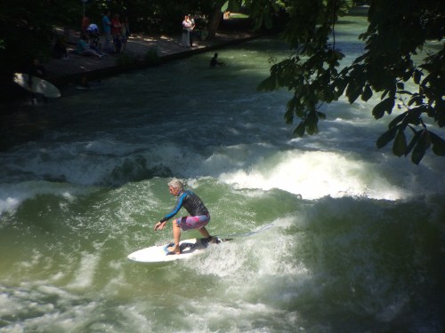 I had heard about river surfing in Munich, so we followed one of the cycling surfers to the jump-off point at the Prinzregentenstraße bridge over the Isar: