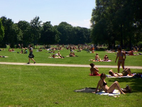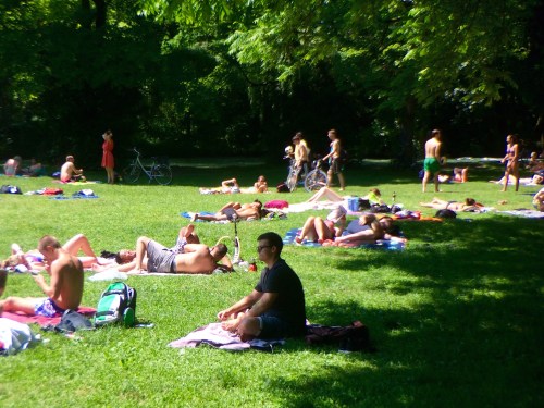 On this sunny day, nearly every student in Munich was lounging around on the grass.